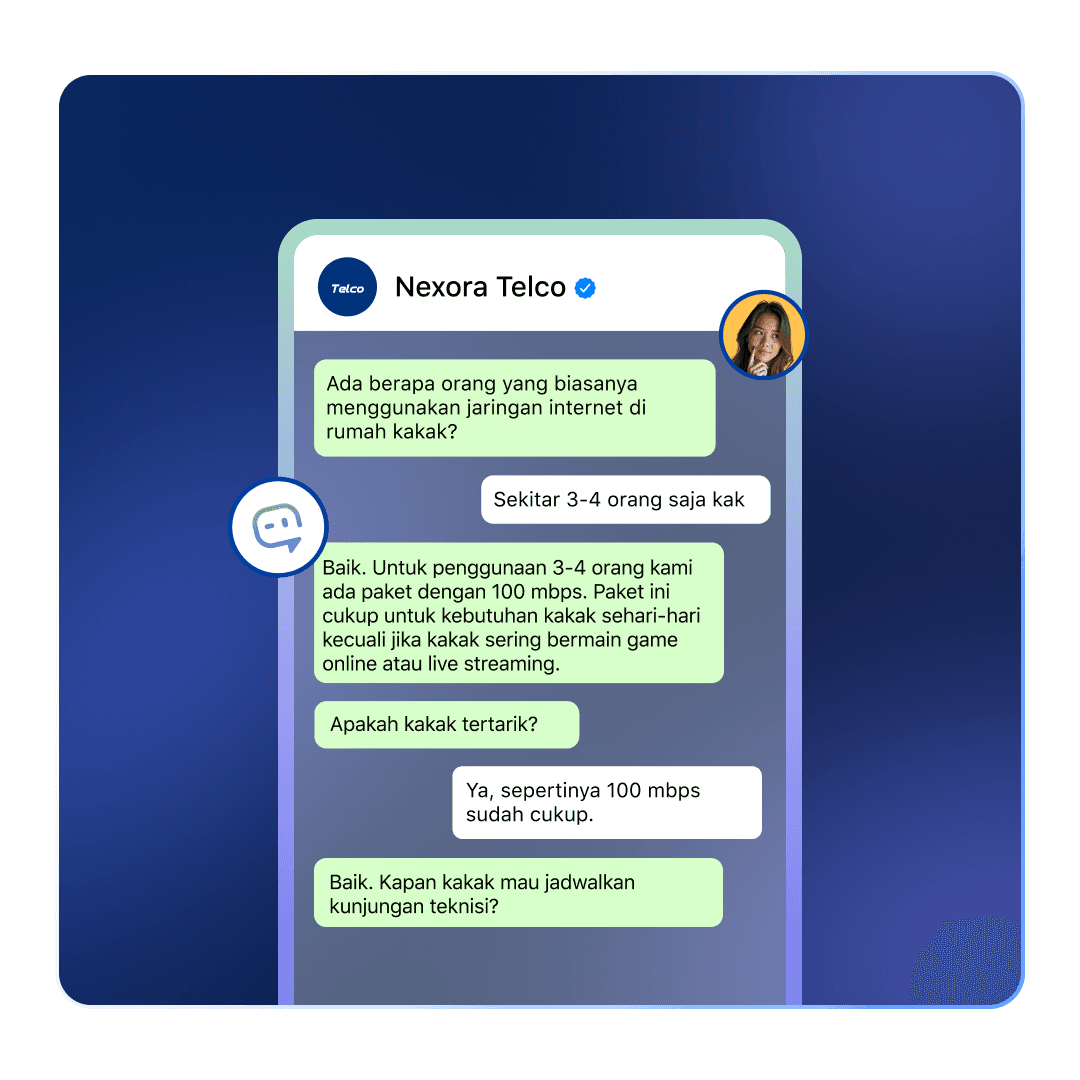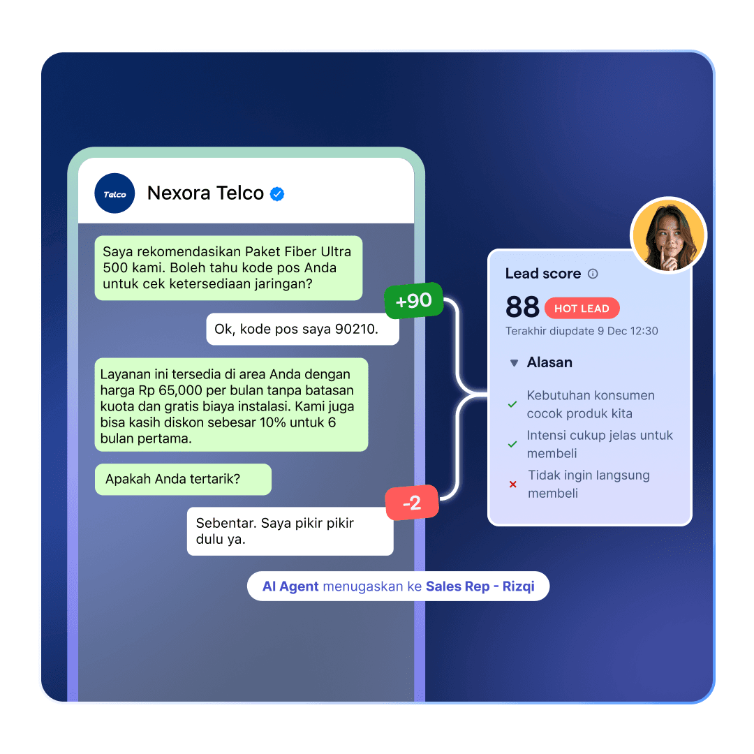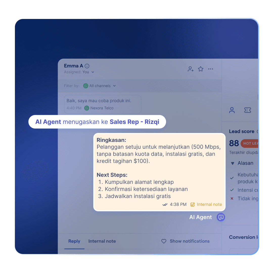 Manfaatkan AI Agent untuk membantu menjawab pertanyaan customer 24/7 sebelum eskalasi ke staf.