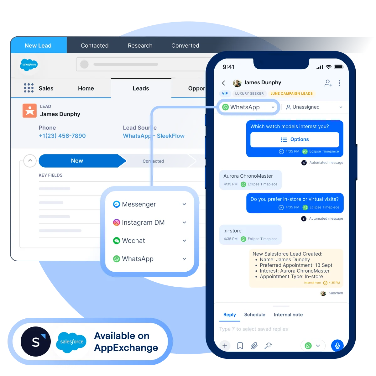 Somos um parceiro certificado do Salesforce listado no Salesforce AppExchange, oferecendo tranquilidade e garantindo que o SleekFlow é uma escolha confiável e segura para sua integração do WhatsApp com o Salesforce.